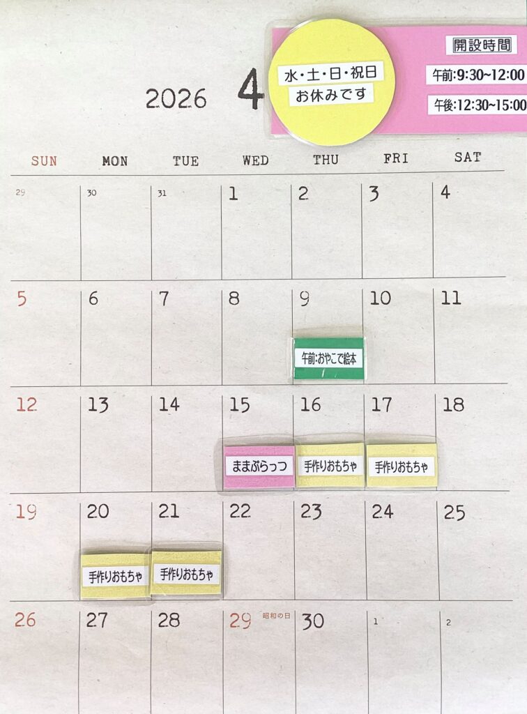 - 部屋のそうじやおもちゃの消毒は、毎日行います。